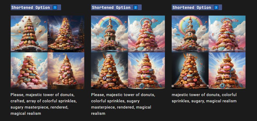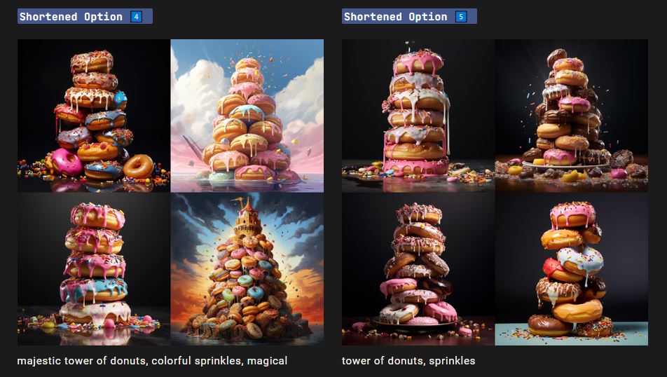 El prompt más corto, Opción 5️⃣: torre de donas, chispas, produjo una imagen más cercana al objetivo original. Muchas de las palabras de relleno como "caprichoso", "fascinante" y "obra maestra" podrían omitirse. Aprender que "torre" y "mágico" eran considerados tokens importantes ayuda a explicar por qué algunas imágenes se generaron con elementos de castillos de cuentos de hadas. Aprender esto proporcionó una pista de que "mágico" debería eliminarse del prompt si el objetivo era crear un montón de deliciosas donas.