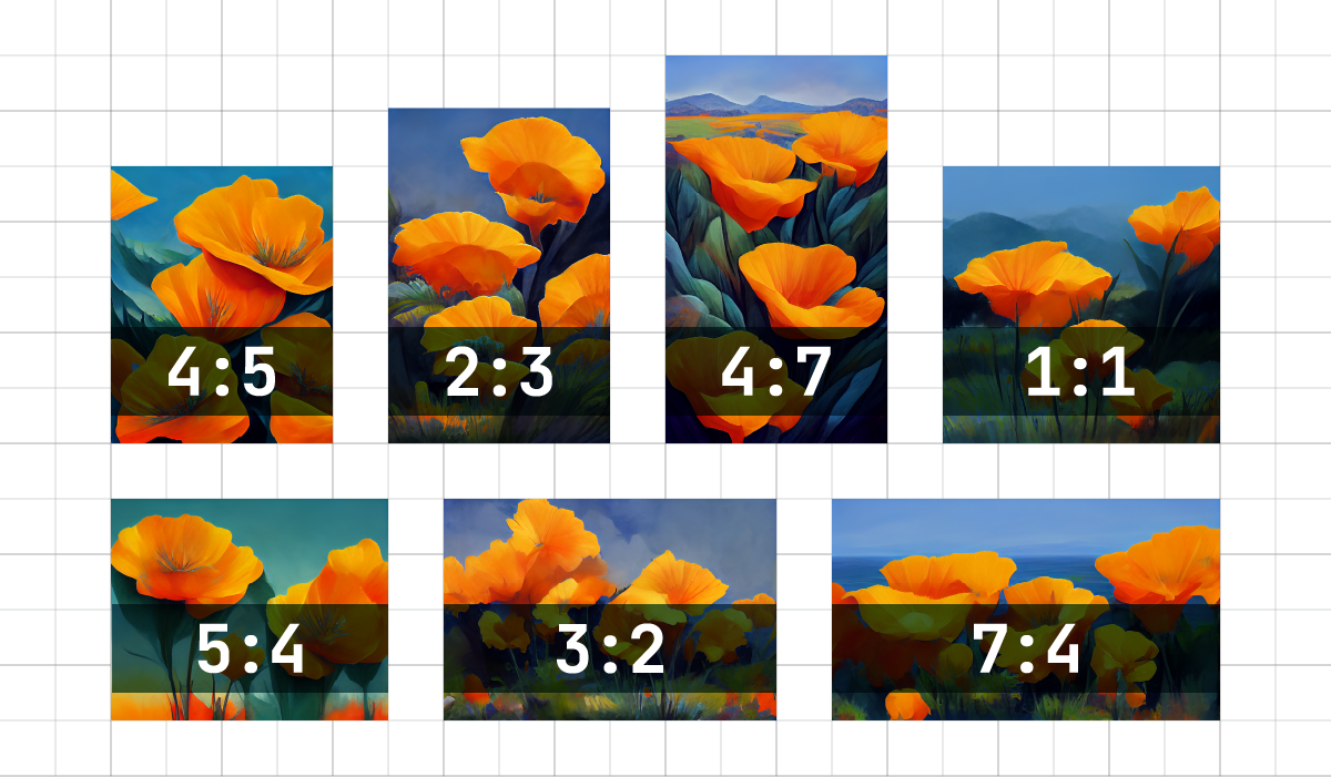 El parámetro --ar aceptará cualquier proporción desde 1:1 (cuadrado) hasta la proporción máxima para cada modelo. Sin embargo, las salidas finales pueden modificarse ligeramente durante la generación o el aumento de la imagen. Ejemplo: los prompts que usan --ar 16:9 (1.78) crean imágenes con una proporción de 7:4 (1.75).